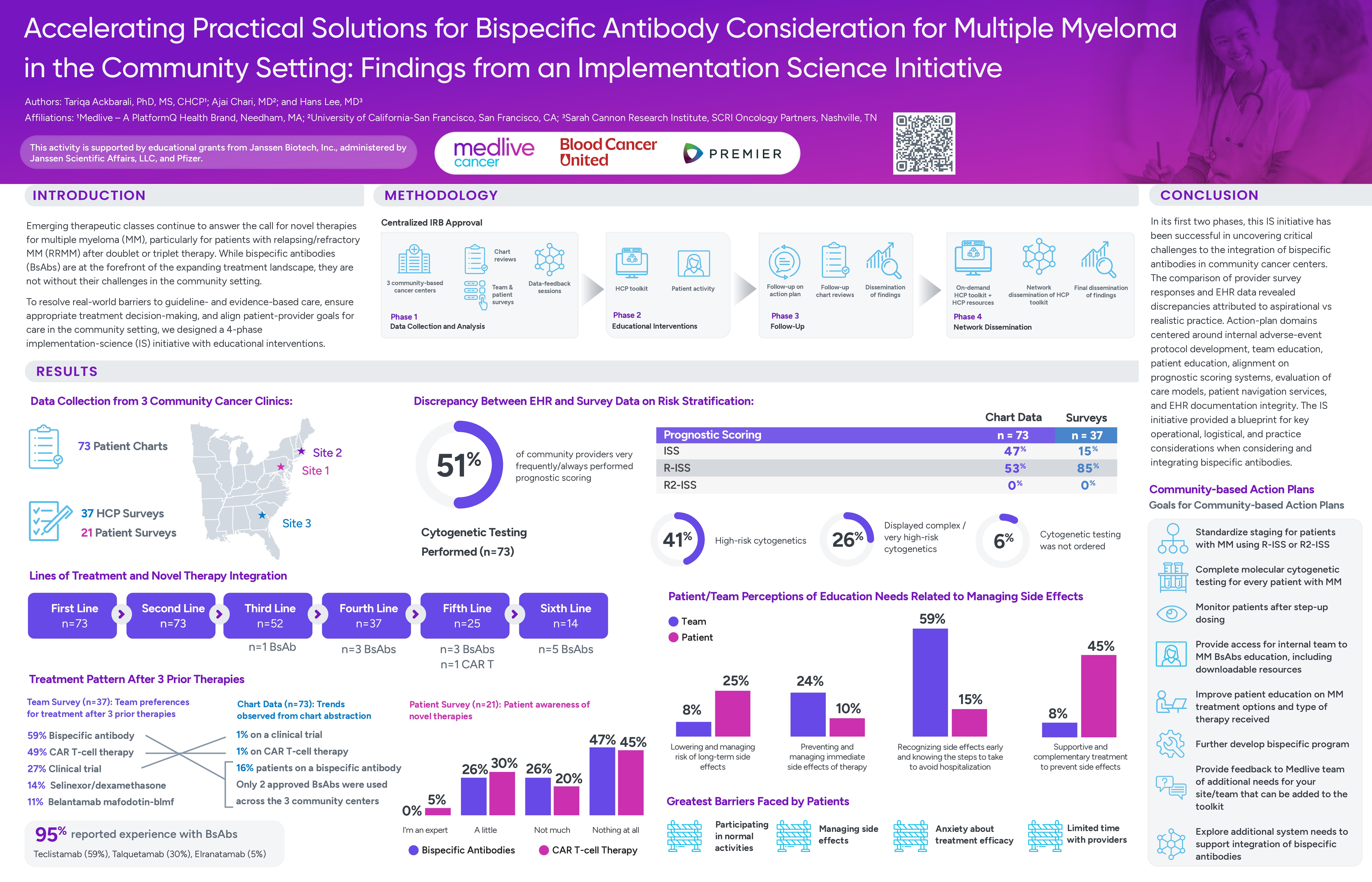 Despite growing familiarity with BsAbs, real-world implementation often lags behind evidence-based recommendations. Community providers cite uncertainty in adverse event (AE) management, limited patient education tools, and gaps in prognostic scoring and cytogenetic testing. These barriers underscore the need for targeted education that combines clinical data with practical, systems-based strategies to improve readiness and equitable access to advanced MM therapies.
