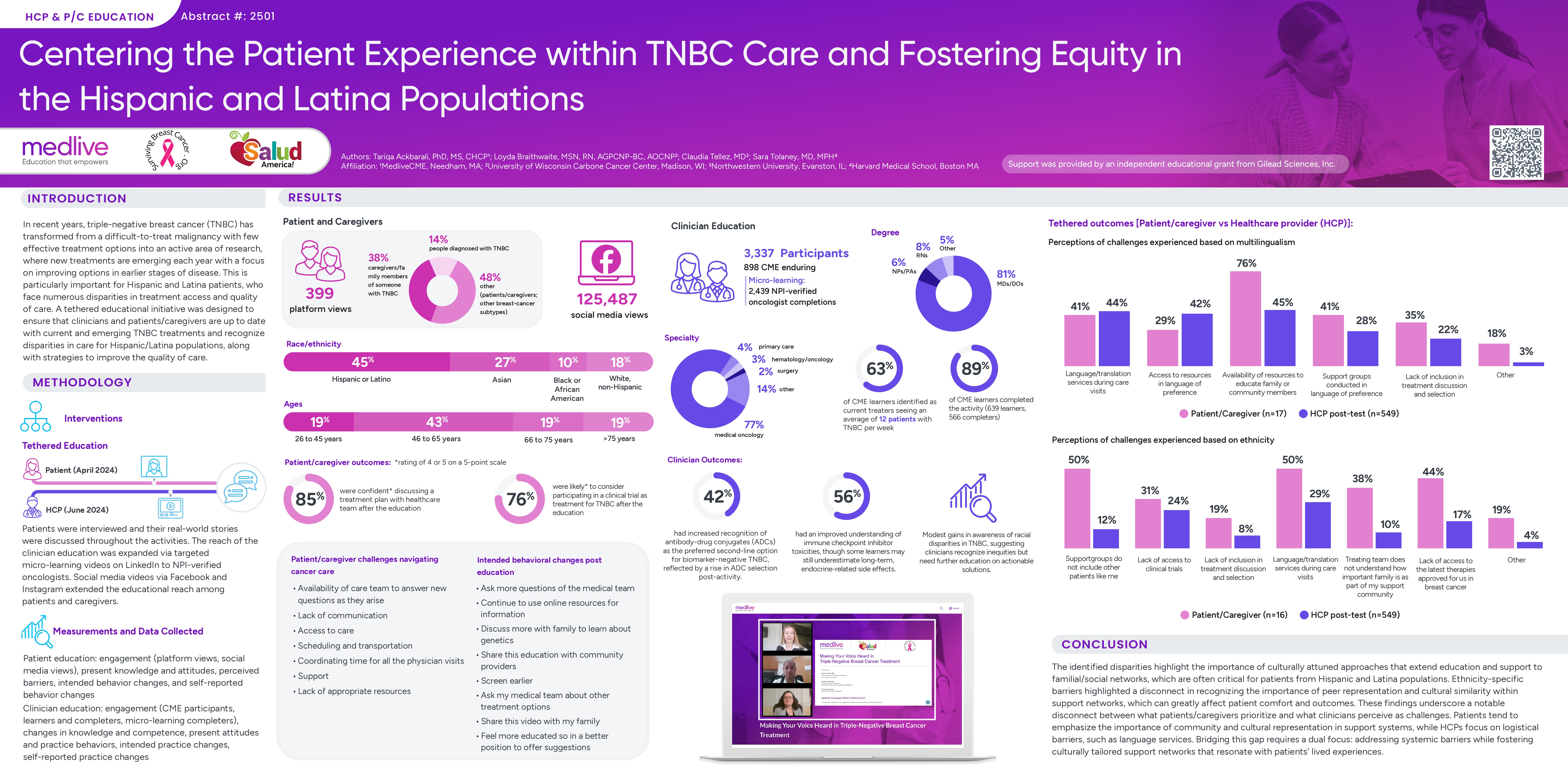 To address these disparities, Medlive partnered with Salud America! and Surviving Breast Cancer.org to design a tethered educational initiative that delivered aligned learning experiences for clinicians and patients/caregivers. The goal was to improve awareness of current and emerging TNBC treatments, illuminate disparities affecting Hispanic and Latina patients, and provide actionable strategies to strengthen communication and shared decision-making.